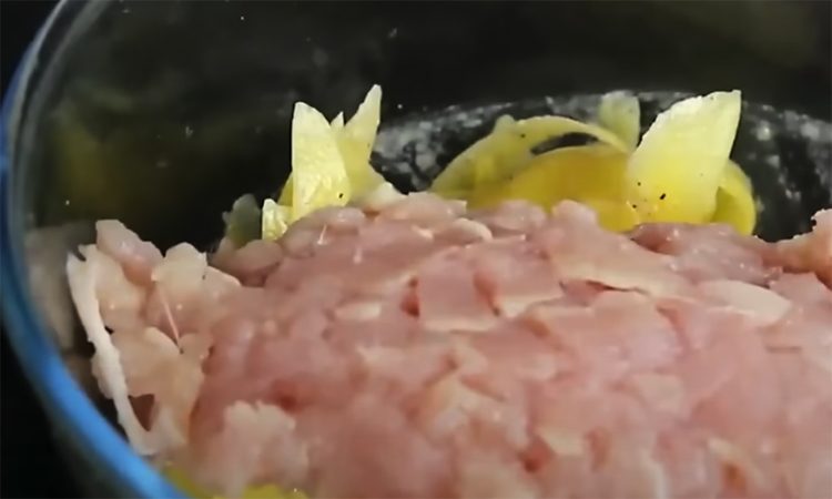 Куриное филе тоже не требует разморозки — достаточно нарезать его той же овощечисткой тонкими слайсами, которые добавят запеканке нежности и соков. Добавляем филе к картошке и снова все тщательно перемешиваем.