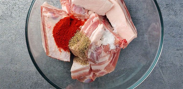 2. В миске смешайте копченую паприку, черный молотый перец и соль. Обваляйте куски ребер в этой смеси, равномерно распределяя специи по мясу.