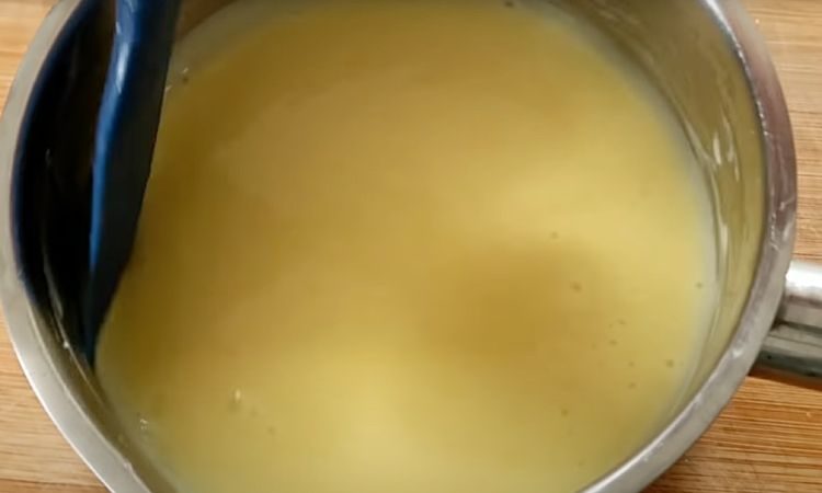 4. Перелейте смесь в кастрюлю с толстым дном, это поможет избежать пригорания. Поставьте кастрюлю на слабый огонь. Постоянно помешивайте смесь венчиком, чтобы избежать образования комков. Готовьте в течение 5-7 минут, пока крем не начнёт загустевать. Температура должна быть низкой, чтобы яйца не свернулись.