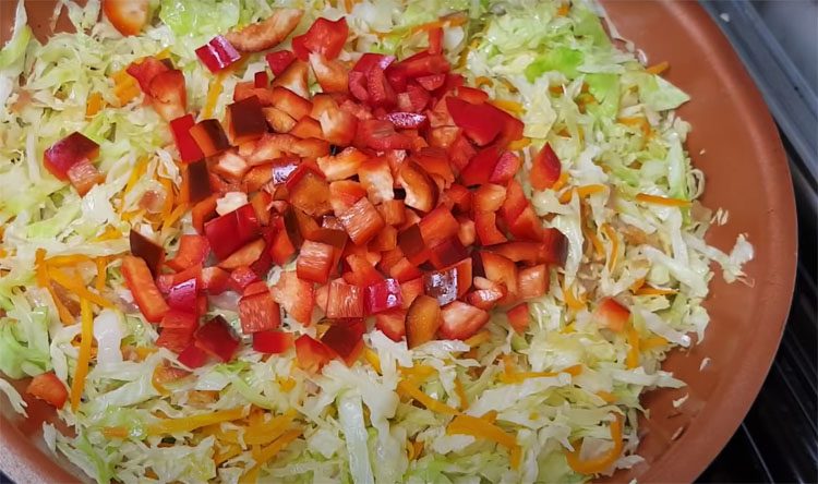 3. Затем добавьте капусту и сладкий перец. Посолите, поперчите, добавьте любимые специи по вкусу (например, паприку, черный перец). Тушите все вместе, помешивая, около 5-7 минут до мягкости овощей. Снимите сковороду с огня и дайте начинке немного остыть.