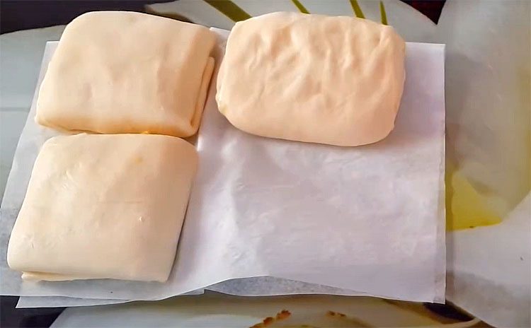 3. После смазывания сложите лепешку пополам, а затем еще раз пополам, чтобы получился треугольник. Слегка раскатайте получившийся треугольник, чтобы он стал чуть тоньше и сохранил форму. Это придаст лепешке слоистую текстуру после обжаривания.
