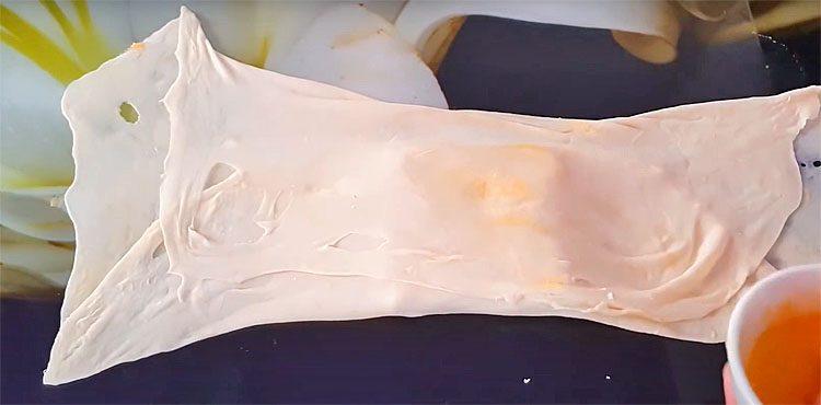 2. После 15 минут, перенесите тесто на присыпанную мукой рабочую поверхность. Разделите тесто на равные кусочки размером с мячик для гольфа (примерно 10-12 штук). Каждую часть раскатайте в тонкую круглую лепешку толщиной около 2-3 мм с помощью скалки. Растопите 50 г сливочного масла. С помощью кисточки или ложки смажьте поверхность каждой раскатанной лепешки тонким слоем масла.