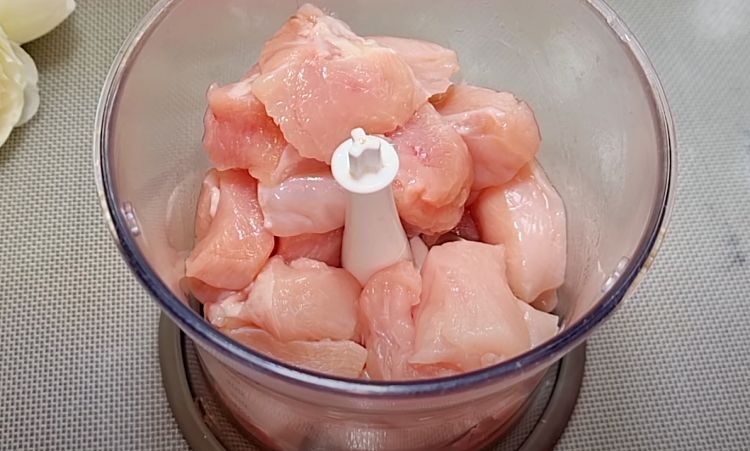2. В чашу блендера положите нарезанное куриное филе, измельчите. После разбейте туда яйцо, выдавленный чеснок и молоко. Посолите, добавьте паприку и приправы для курицы. Закройте крышку блендера и еще раз измельчите все до однородной массы. Это займет примерно 1-2 минуты. Убедитесь, что нет крупных кусочков курицы.