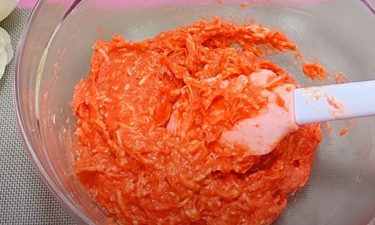 3. Перелейте полученную массу в глубокую миску. Натрите сыр на крупной терке и добавьте в куриную массу. Тщательно перемешайте, чтобы сыр равномерно распределился по всей смеси.