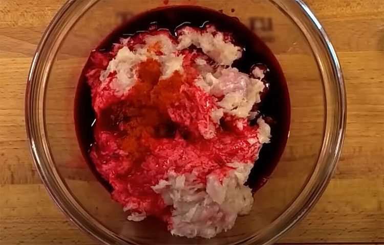 4. В первую миску добавьте 40 мл свекольного сока и 1 ч. л. сладкой паприки, тщательно перемешайте. Во вторую миску измельчите 150 г свежего шпината в блендере до состояния пюре, затем влейте его в фарш и добавьте свекольный сок для более яркого цвета, хорошо перемешайте. В третью миску добавьте 1 ч. л. куркумы и 1 ч. л. горчичного порошка, затем перемешайте.