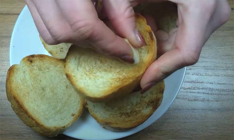 2. Очистите зубчики чеснока и разрежьте их пополам. Натрите гренки чесноком с обеих сторон. Это придаст намазке приятный аромат и дополнительный вкус.