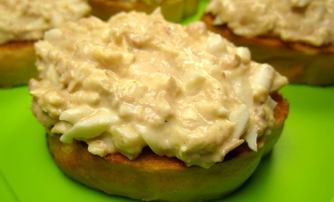3. В небольшой миске натрите вареные яйца на мелкой терке. Это придаст намазке нежную текстуру. Добавьте к яйцам натертый плавленый сыр. Откройте банку консервированного тунца и слейте сок. Переместите тунец в миску с яйцами и сыром. Добавьте майонез по вкусу, чтобы достичь желаемой кремовой консистенции. Приправьте солью и черным перцем по вкусу. Хорошо перемешайте все ингредиенты в миске до получения однородной массы. Убедитесь, что все компоненты равномерно распределены.