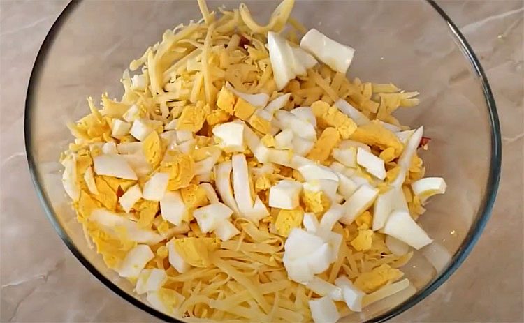 1. Порежьте колбасу соломкой, яйцо нарежьте кубиками, а сыр натрите на крупной терке. Сложите все ингредиенты в одну миску и тщательно перемешайте. Отложите смесь в сторону.