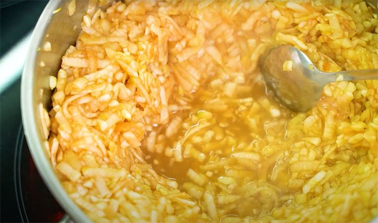 3. Яблоки очистите от кожуры и удалите сердцевину. Натрите их на крупной терке. Переложите тертые яблоки в сотейник, добавьте лимонную цедру и сахар. Хорошо перемешайте. Поставьте сотейник на слабый огонь и варите около 15 минут, пока яблоки не станут мягкими и не превратятся в пюреобразную массу. Дайте готовой начинке полностью остыть перед сборкой пирога.