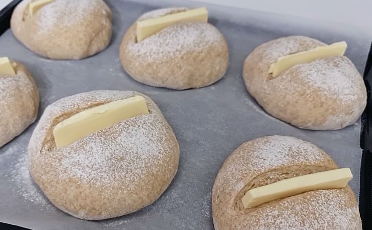 5. Пока булочки поднимаются, разогрейте духовку до 200°C. Сделайте небольшой надрез посередине каждой булочки — это позволит хлебу красиво раскрыться во время выпекания. Вставьте в каждый надрез по маленькому кусочку сливочного масла. Оно растопится при выпекании, что придаст хлебу румяную и хрустящую корочку.