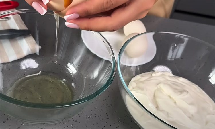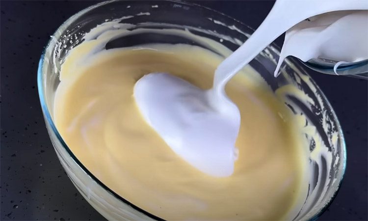 Аккуратно смешайте белки с яично-сметанной массой, сохраняя воздушную текстуру. Форму диаметром 18 см смажьте маслом, дно застелите бумагой.