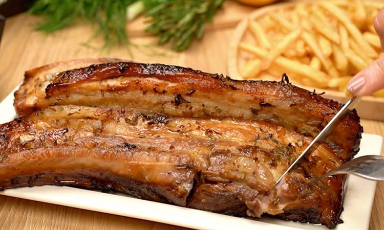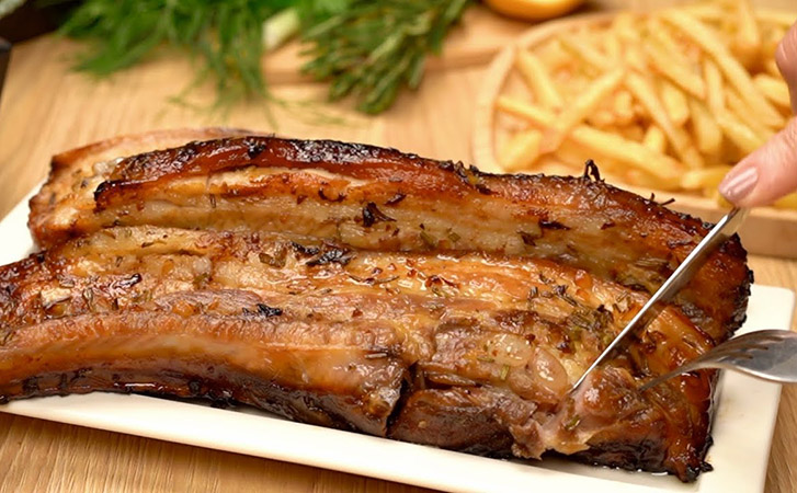 Грудинка — один из самых недорогих мясных отрубов, но и ее можно приготовить невероятно вкусной. Обильная жировая прослойка не будет проблемой, если запечь грудинку под чесноком, а сначала дать ей немного промариноваться. Мясо получится сочным и очень мягким, сохранив при этом аппетитно хрустящую корочку.