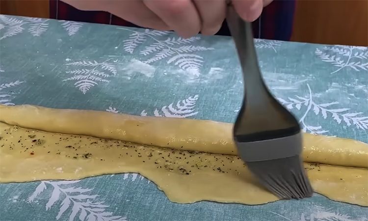 Для начинки пропустите чеснок через пресс, добавьте специи и соль, перемешайте с растительным маслом. Выложите начинку на тесто, сверните его в рулет и нарежьте на небольшие кусочки. Когда картофель будет готов, добавьте в бульон зажарку и куриное мясо.