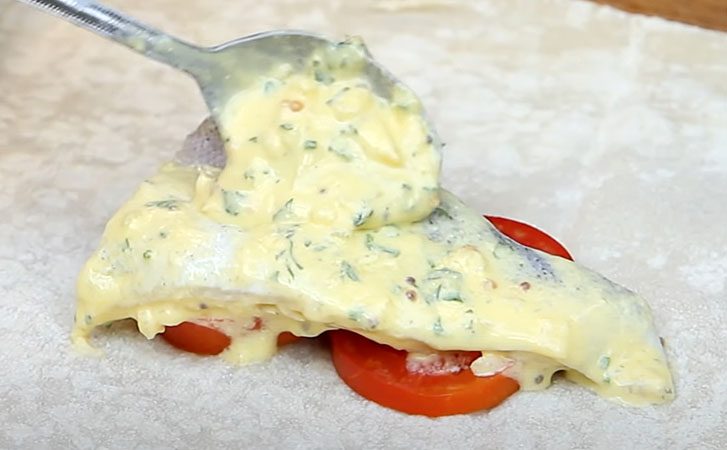 3. На чистую рабочую поверхность положите один лист тонкого лаваша. Выложите на лаваш два кружочка нарезанных помидоров, распределив их по центру. Сверху на помидоры положите один порционный кусочек минтая. Полейте рыбу несколькими столовыми ложками приготовленного соуса так, чтобы она была покрыта. Аккуратно заверните лаваш в форме конверта, чтобы начинка была полностью закрыта. Повторите эти шаги для каждого кусочка минтая и оставшегося лаваша.