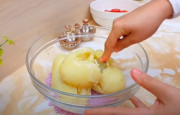 3. Возьмите удобную глубокую форму для запекания и обильно смажьте ее сливочным маслом. Это предотвратит прилипание пюре к форме и добавит дополнительный вкус. Выложите картофельное пюре в форму, равномерно распределяя его по дну. Убедитесь, что пюре плотно прилегает к стенкам формы. Помидоры черри тщательно промойте и нарежьте на четвертинки. Аккуратно вставьте половинки помидоров в картофельное пюре, распределяя их равномерно по всей поверхности. Это не только добавит вкуса, но и сделает блюдо более красивым.