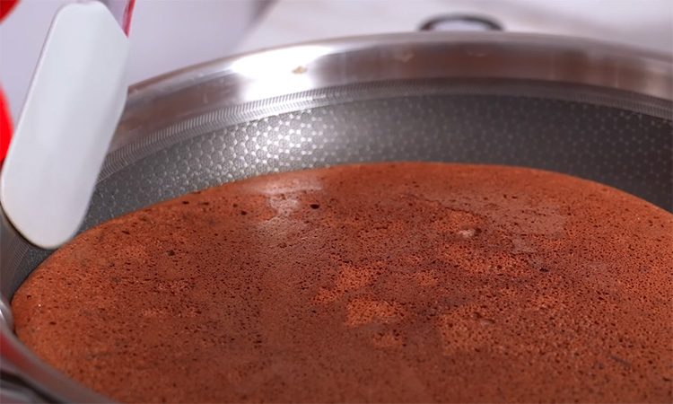 В миске отделите белки от желтков. Белки взбейте с щепоткой соли до пышности, постепенно добавляя сахар. Затем добавьте желтки и перемешайте. Введите молоко, просеянные муку и какао. Аккуратно соедините до однородности. Сковороду смажьте маслом и равномерно распределите тесто. Готовьте под крышкой на слабом огне, пока поверхность не станет матовой.
