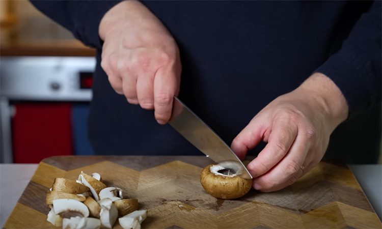 Картофель, куриную грудку и яйца сварите заранее до готовности, остудите. Шампиньоны нарежьте пополам, затем крупными кусками. На раскалённой сковороде с небольшим количеством масла обжарьте грибы до золотистой корочки, добавив щепотку соли. Выложите их на бумажное полотенце, чтобы избавиться от лишнего жира.