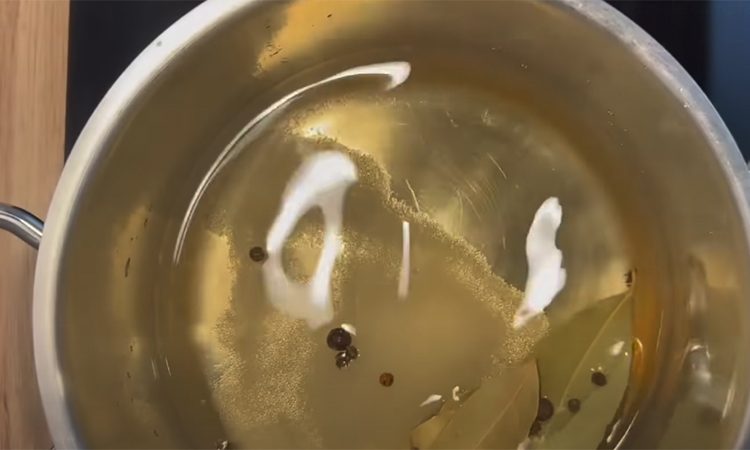 В кастрюлю налейте воду, добавьте уксус, сахар, соль, лавровый лист, душистый и черный перец. Хорошо перемешайте и доведите до кипения. Уменьшите огонь и варите маринад 10 минут, чтобы он пропитался ароматами. Затем снимите с огня и дайте полностью остыть. Лук нарежьте кольцами или полукольцами.