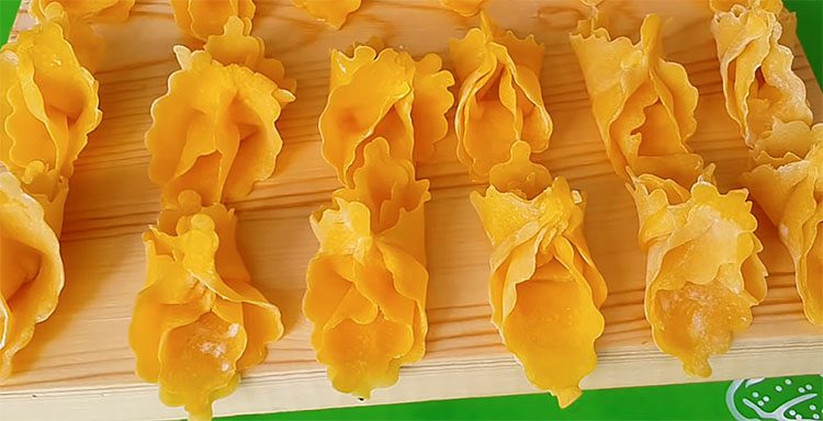 2. Разделите тесто на 2–3 части для удобства. Каждую часть раскатайте в тонкий пласт толщиной 1–2 мм. Нарежьте пласт на длинные полоски шириной 1 см, затем нарежьте их на небольшие кусочки длиной около 1–2 см. Если хотите, можно скрутить кусочки теста в небольшие конвертики или оставить их простыми полосками.