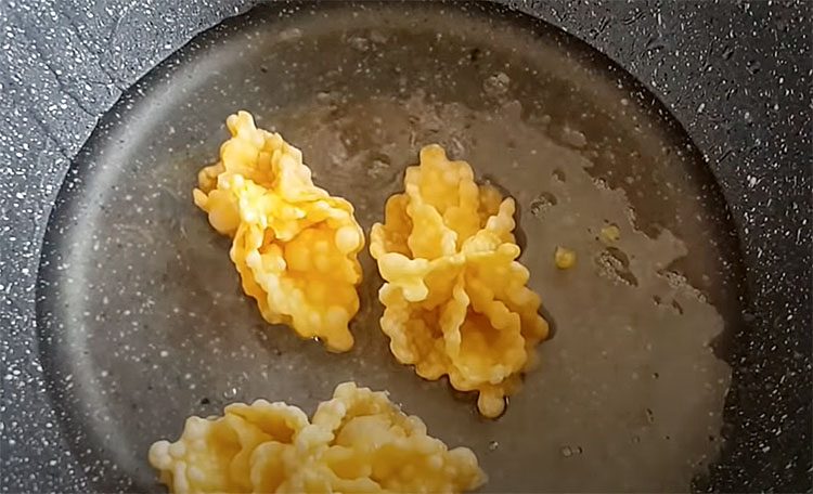 3. В глубокой сковороде или кастрюле разогрейте растительное масло до температуры около 180 °C. Для проверки температуры можно опустить небольшой кусочек теста: если он быстро всплывает и начинает шипеть, масло готово. Порциями опускайте заготовки в масло, стараясь, чтобы они не слипались. Обжаривайте каждую партию 1–2 минуты до золотистого цвета, постоянно перемешивая шумовкой для равномерной прожарки. Выложите готовые кусочки на бумажное полотенце, чтобы удалить лишний жир.