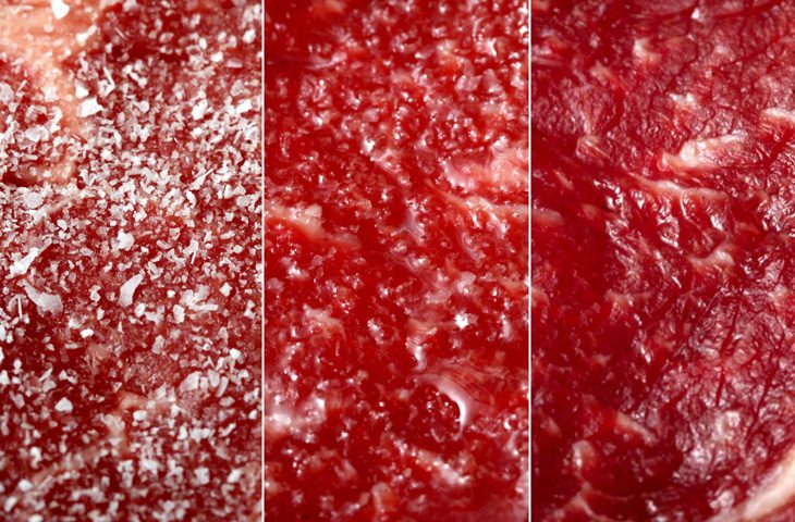Моментальная солка: если мясо солить сразу перед жаркой, кристаллы соли остаются на поверхности, не успевая впитаться в мясо. В этом случае мясные соки заперты внутри ткани, а на поверхности, при контакте с раскалённой сковородой, образуется аппетитная хрустящая корочка. Это позволяет сохранить сочность и добавить приятную текстуру блюду.