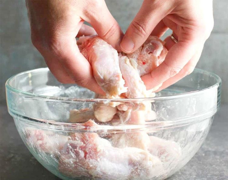 1. Промойте куриные крылышки под холодной водой и обсушите бумажными полотенцами. Разрежьте каждое крыло на три части по суставам: кончик, среднюю часть и основание. Кончики можно не использовать, так как в них мало мяса. Слегка посолите крылышки, чтобы они были вкуснее, но учтите, что соевый соус также добавит солености.