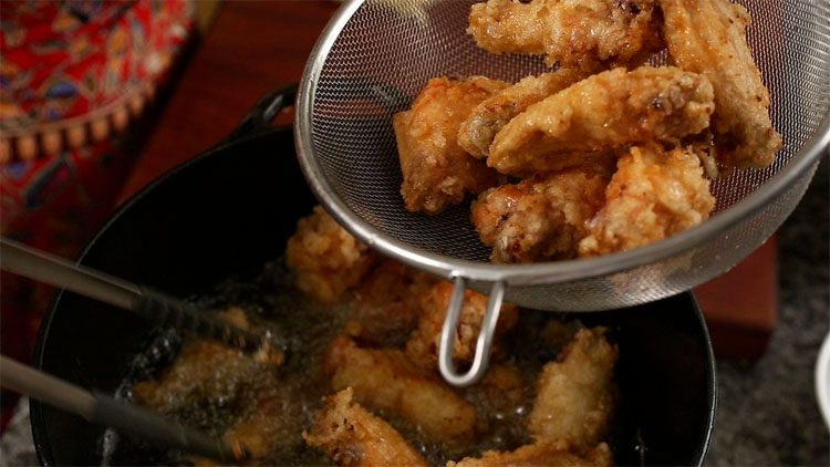 6. Достаньте готовые крылышки с помощью щипцов или шумовки и выложите их на бумажные полотенца, чтобы убрать лишний жир.