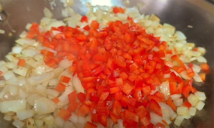 Далее добавьте болгарский перец, перемешайте и жарьте, пока он слегка не подрумянится. Вы можете заменить овощи на другие по своему вкусу, например, морковь или даже замороженные овощи. После этого в сковороду добавьте немного сливочного масла, затем куриные сердечки. Обжаривайте их 5-7 минут, не перемешивая сразу, чтобы они хорошо подрумянились. Когда сердечки подрумянятся с одной стороны, добавьте чеснок и жарьте ещё минуту.