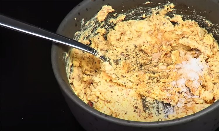 Отварите яйца вкрутую, затем разрежьте их пополам и аккуратно извлеките желтки. Переложите желтки в миску, добавьте к ним шпроты, оставив несколько кусочков для украшения. Разомните массу вилкой до однородности, добавьте майонез, горчицу, сушеный чеснок, немного соли и перца.