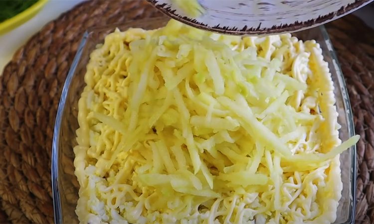 Выложите курицу первым слоем в прозрачную салатницу и равномерно покройте его тонким слоем майонеза. Следующим слоем выложите жареный лук. На него распределите тёртые на крупной тёрке варёные яйца, поверх которых сделайте сеточку из майонеза. Теперь снимите кожуру с яблока, натрите его на крупной тёрке и уложите сверху.