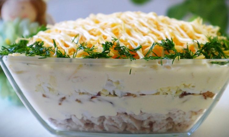 Этот слой также смажьте майонезом для сочности. Завершающим слоем выложите натёртый на мелкой тёрке сыр, украсив салат мелко нарезанным укропом.