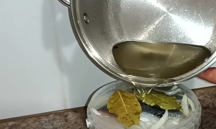 Затем укладывайте сельдь в контейнер, плотно друг к другу, стоя, а между слоями рыбы добавляйте немного лука. Таким образом, создайте несколько слоев. После того как маринад остынет, залейте им рыбу, аккуратно разложив специи по банке. Закройте контейнер и отправьте его в холодильник на 24 часа. Через сутки рыба будет готова.