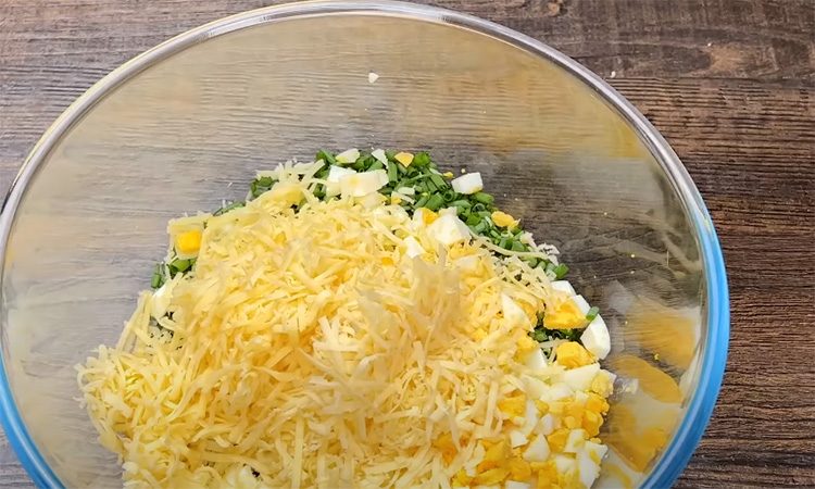 Очистите лук, нарежьте его мелкими кубиками и слегка обжарьте до прозрачности. Яйца для начинки сварите вкрутую, остудите, очистите и нарежьте небольшими кубиками. В миске соедините нарезанные яйца, обжаренный лук и натёртый сыр.