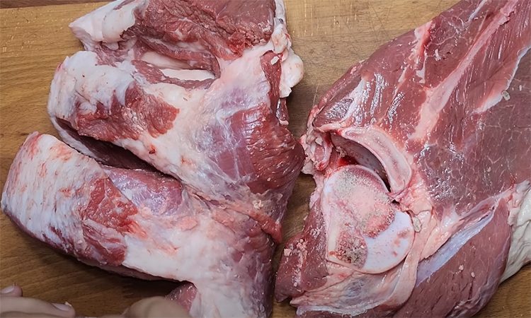 Говядину нарежьте вдоль волокон, отделяя грудную кость. Мясо разделите на удобные куски для дальнейшего снятия мякоти. Следующий шаг — нарезка лука. Лук должен быть мелким, не крупным, чтобы он лучше смешивался с мясом. После того как все подготовлено, начните укладывать мясо в банки, чередуя его с лавровым листом и кусочками жира. Жир всегда укладывайте первым, а мякоть — сверху.
