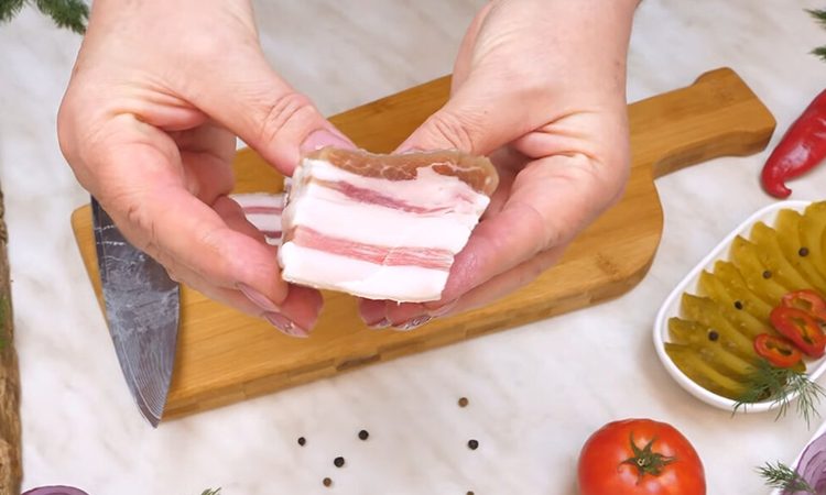Сало отлично сочетается с маринованным луком, огурцами, чесноком и свежим ржаным хлебом.