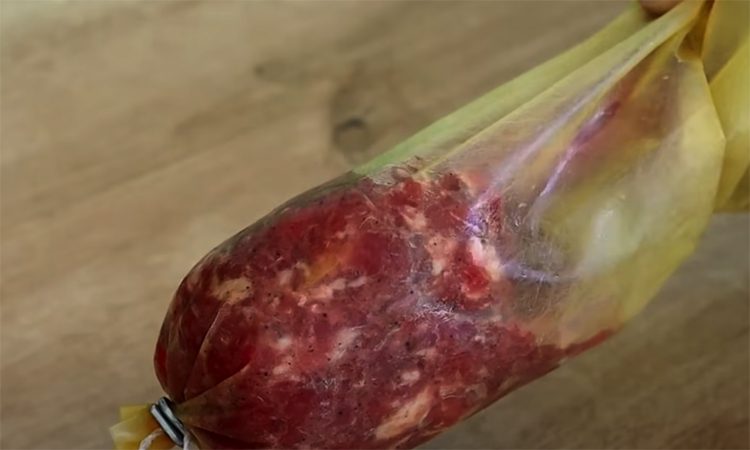 Сыр натрите на терке и добавьте к мясу, еще раз тщательно перемешайте. Поместите смесь в холодильник на 24 часа для маринования. Затем подготовьте коллагеновую оболочку: замочите ее в теплой воде на 5 минут, чтобы она стала мягче. Наполните оболочку фаршем, плотно утрамбовывая его, чтобы избежать пустот.
