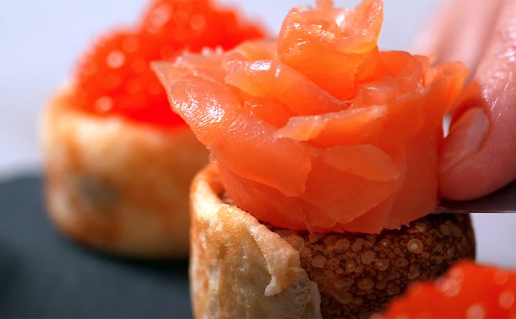 Выпекайте тонкие блины, накрывая их крышкой сразу после снятия со сковороды — так они останутся мягкими и эластичными. На каждый остывший блин положите тонкий слой сливочного масла, сверху распределите ломтики красной рыбы, а в центр добавьте небольшую порцию красной икры.