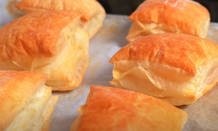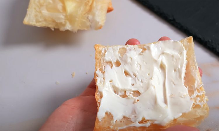 Разогрейте духовку до 200 градусов. Слоёное тесто нарежьте на 9 или 12 квадратов, в зависимости от формы теста и желаемого размера. Если тесто прямоугольное, лучше разрезать его на 12 частей. Разложите квадраты на противне, оставляя немного пространства между ними, и выпекайте 15–18 минут до золотистого цвета. После этого дайте заготовкам остыть до комнатной температуры.