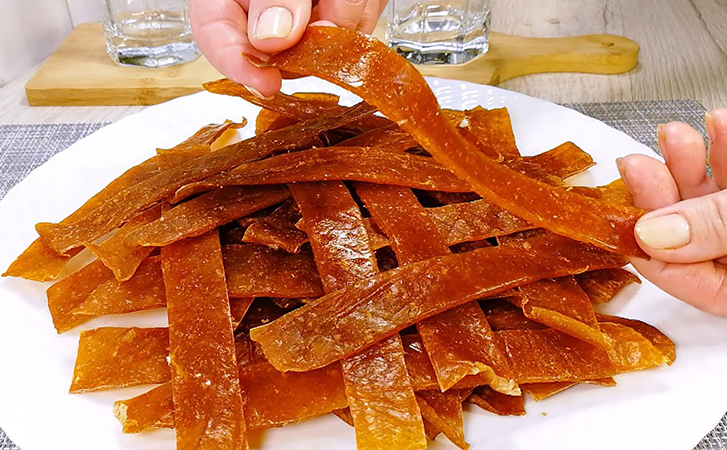 После сушки нарежьте готовую пастилу на полоски. Более тонкие края будут хрустящими, а середина — мягче.