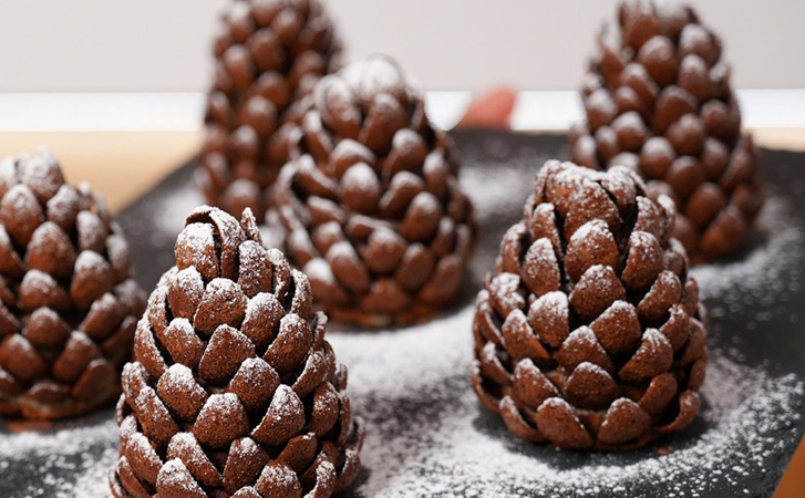 Обваляйте заготовки в какао-порошке. Украсьте кукурузными хлопьями, создавая текстуру шишки. Завершите десерт, посыпав его сахарной пудрой, чтобы создать нужный визуальный эффект.
