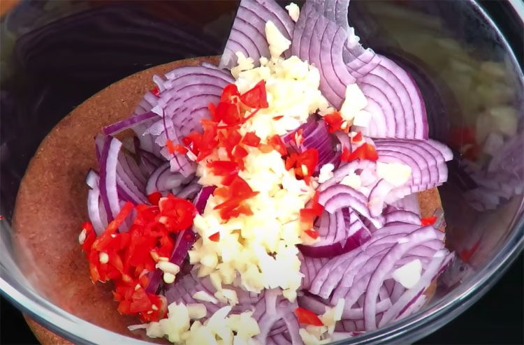 2. Луковицу очистите и нарежьте тонкими четвертькольцами. Перец чили освободите от семян (если хотите уменьшить остроту) и мелко нарежьте. Имбирь очистите и натрите на мелкой тёрке или порубите ножом. Чеснок измельчите ножом или пропустите через пресс. Кинзу промойте, обсушите и мелко порубите.