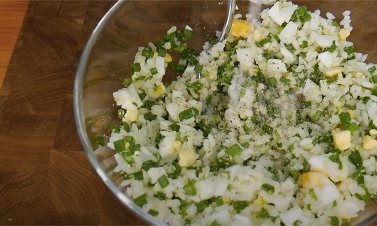 Для теста соедините муку, дрожжи, сахар и соль в миске. Влейте тёплое молоко, добавьте яйцо и замесите мягкое тесто. Постепенно вмешайте размягчённое сливочное масло. Тесто должно стать гладким и эластичным. Накройте плёнкой и оставьте на 2 часа для подъёма. Пока тесто подходит, приготовьте начинку. Отварной рис смешайте с мелко нарезанным варёным яйцом и зелёным луком.