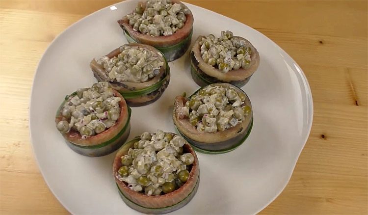 Отварные части разрезаем на три части и вокруг каждого кольцом закрепляем перышком зеленого лука сельдь.