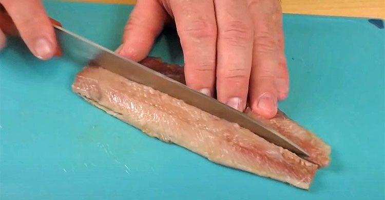 Селедку чистим на филе, выбираем все кости. Теперь накрываем сверху пищевой пленкой и аккуратно отбиваем до равномерной толщины. Затем разрезаем на две части по длине.