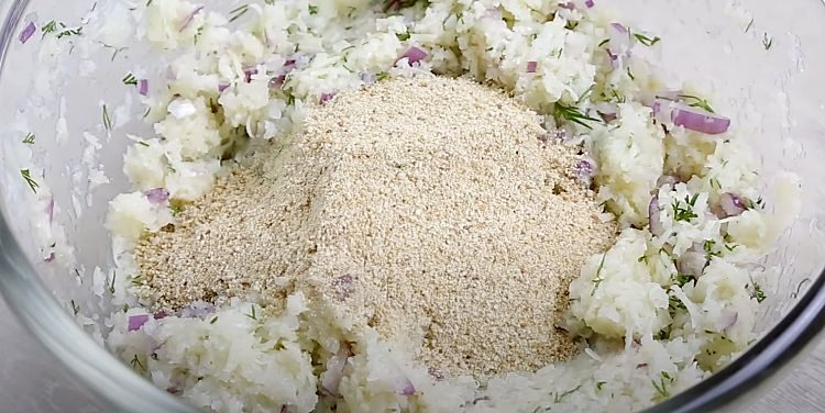 4. В смесь добавьте натертый сыр и тщательно перемешайте, чтобы сыр равномерно распределился в массе. Затем добавьте панировочные сухари. Они придадут котлетам плотность и помогут им не распадаться при жарке или запекании. Еще раз хорошо перемешайте массу. Если она получается слишком жидкой, добавьте немного дополнительных панировочных сухарей.