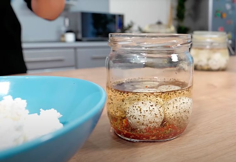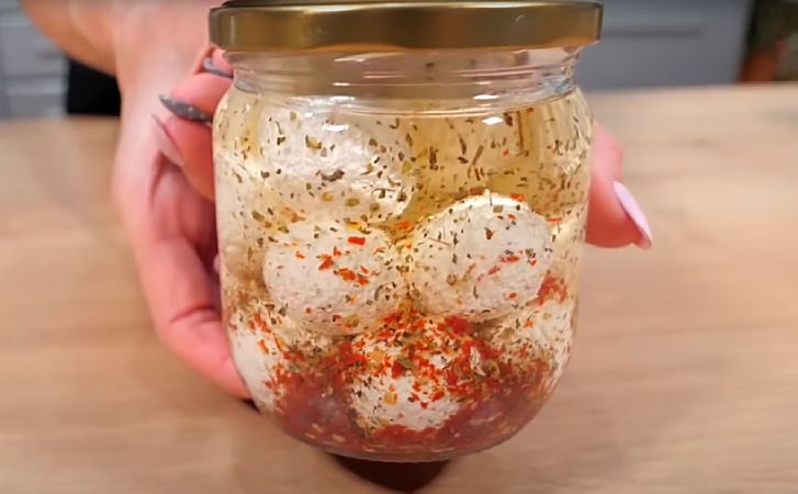 5. В банку с крышкой налейте 200 мл растительного масла (оливковое, подсолнечное или любое другое по вашему выбору). Добавьте в масло специи. Для этого рецепта мы использовали сушеные помидоры с чесноком и базиликом, но можно экспериментировать с другими приправами: орегано, розмарин, тимьян или чили. Перемешайте масло с приправами, чтобы специи равномерно распределились и поместите сырные шарики. Закройте банку крышкой и оставьте в холодильнике на 2-3 часа, чтобы сыр как следует пропитался специями. За это время шарики впитают ароматы масла и станут еще более вкусными.