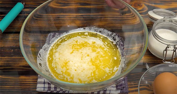 1. В глубокой миске растопите сливочное масло. Это можно сделать в микроволновой печи или на водяной бане. После того как масло растопится, дайте ему немного остыть до комнатной температуры. К растопленному маслу добавьте сахар, ванилин, щепотку соли и яйца. Все тщательно перемешайте венчиком или ложкой до получения однородной массы. Важно, чтобы сахар растворился в смеси, а яйца хорошо перемешались с маслом.
