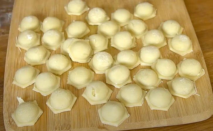 4. После того как тесто отдохнуло, разделите его на несколько частей, чтобы было удобно работать. Каждую часть раскатайте в тонкий круг и положите на форму для пельменей. Можно использовать скалку. В центр каждого круга выложите 1-1,5 ст. л. начинки, сверху закройте другим кругом теста и раскатайте скалкой, чтобы получились пельмешки. Повторяйте процесс до тех пор, пока не использованы все тесто и начинка.