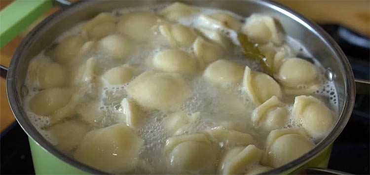5. В большой кастрюле доведите воду до кипения, добавьте соль. Опустите пельмени в кипящую воду, перемешайте, чтобы они не прилипли ко дну. Варите пельмени на среднем огне, пока они не всплывут. Затем продолжайте варить еще 2 минуты, чтобы они стали полностью готовыми. Когда пельмени будут готовы, аккуратно достаньте их шумовкой.