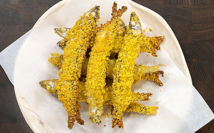 Мойву размораживаем и выкладываем на салфетку, чтобы лишняя влага ушла. В это время панируем рыбу: для панировки используем чипсы со вкусом зелёного лука, которые измельчаем с помощью измельчителя. Чипсы должны быть достаточно мелкими, чтобы обваливать в них рыбу, и при этом сохранять хруст.